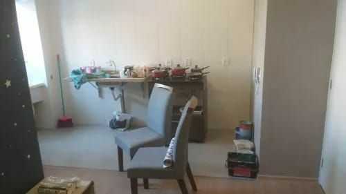 Novo semi mobiliado no 1º andar, 01 quarto com armário e cama e outro com projeto e madeiras para finalizar.