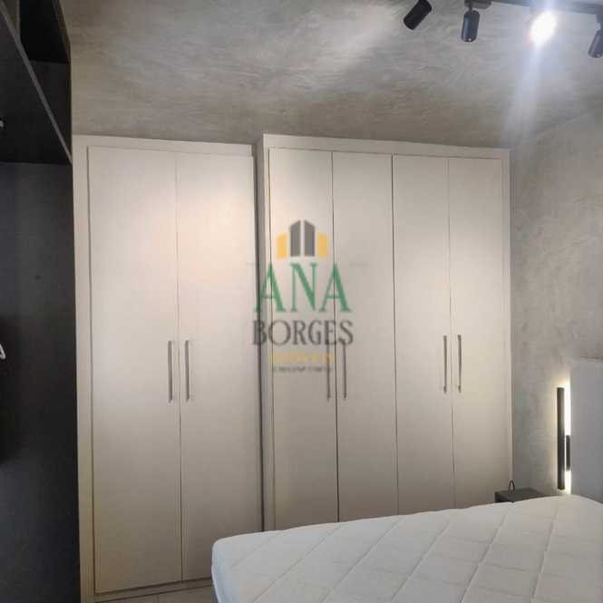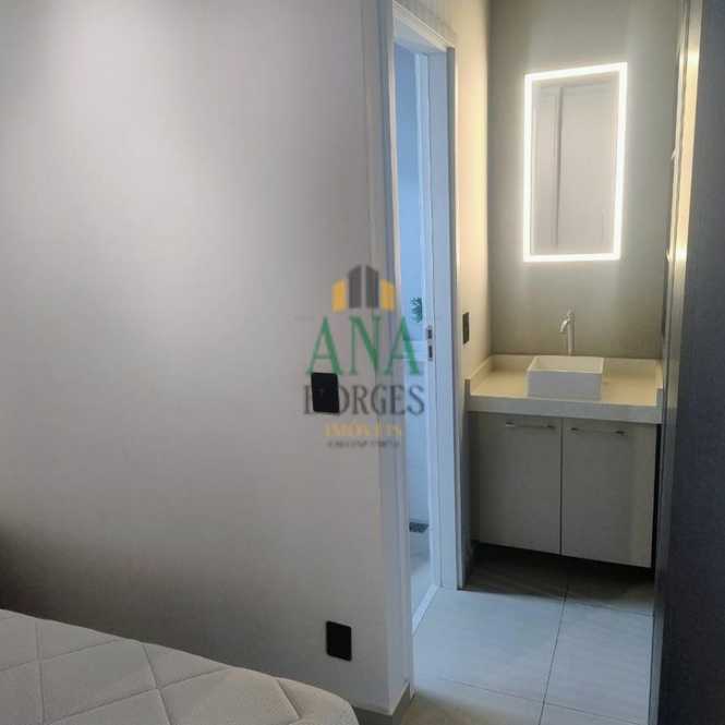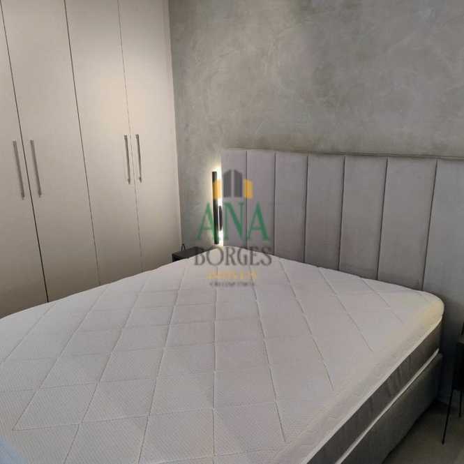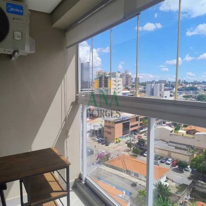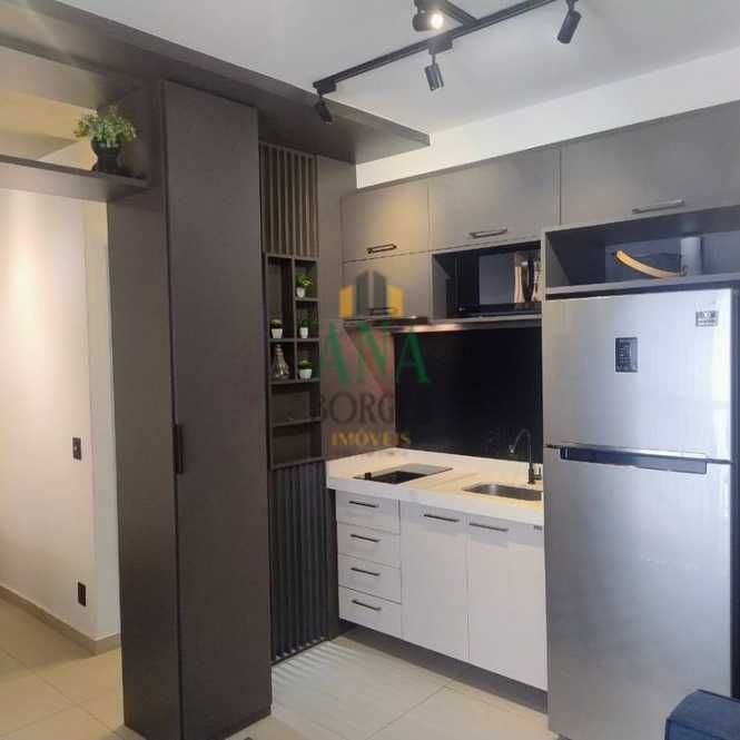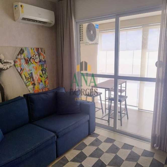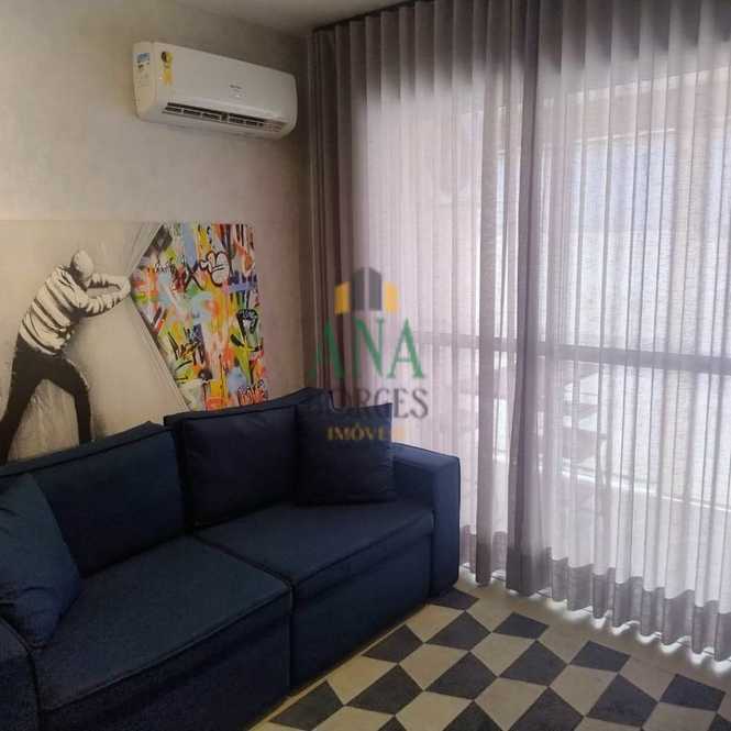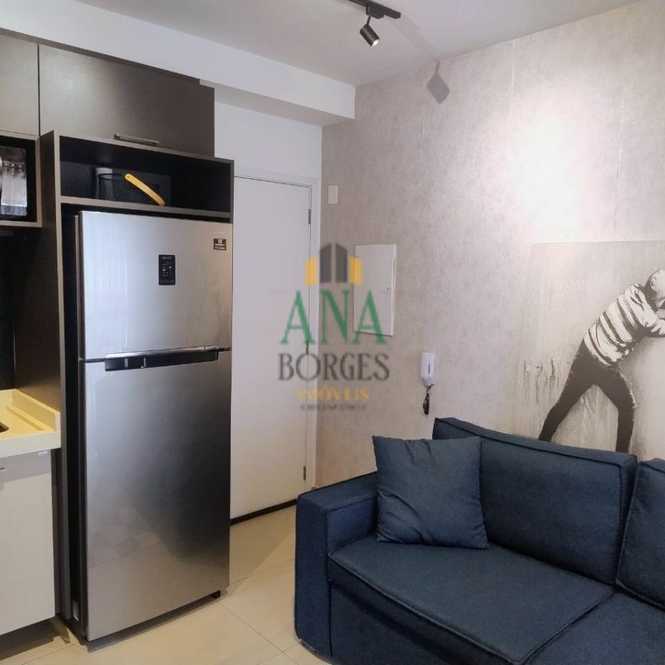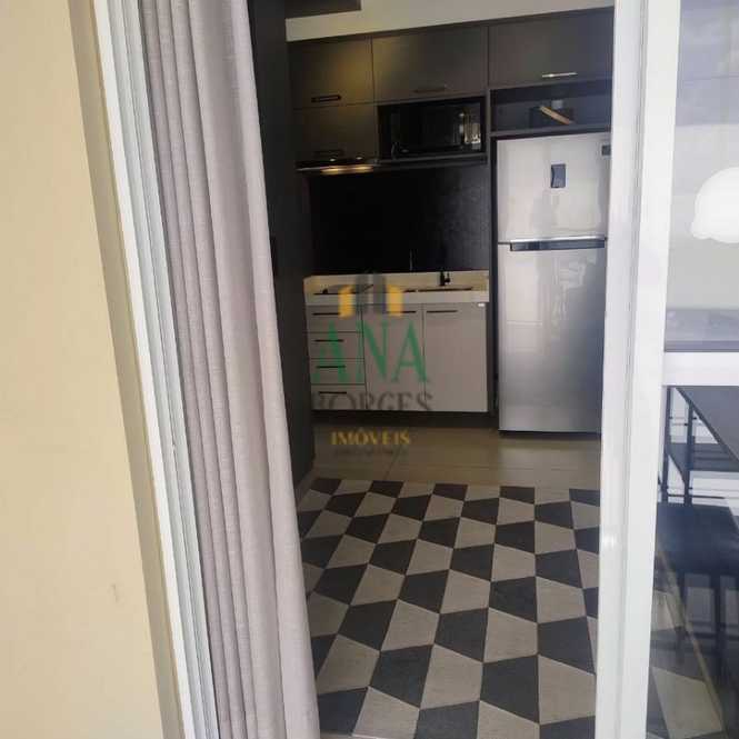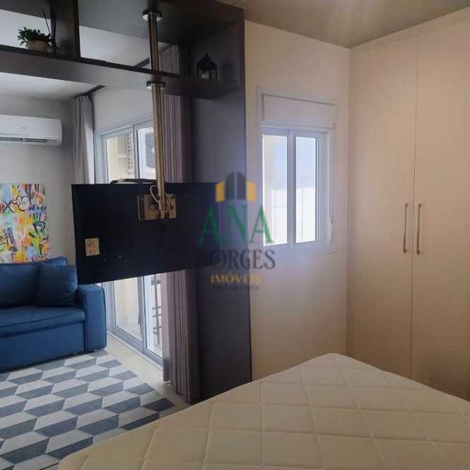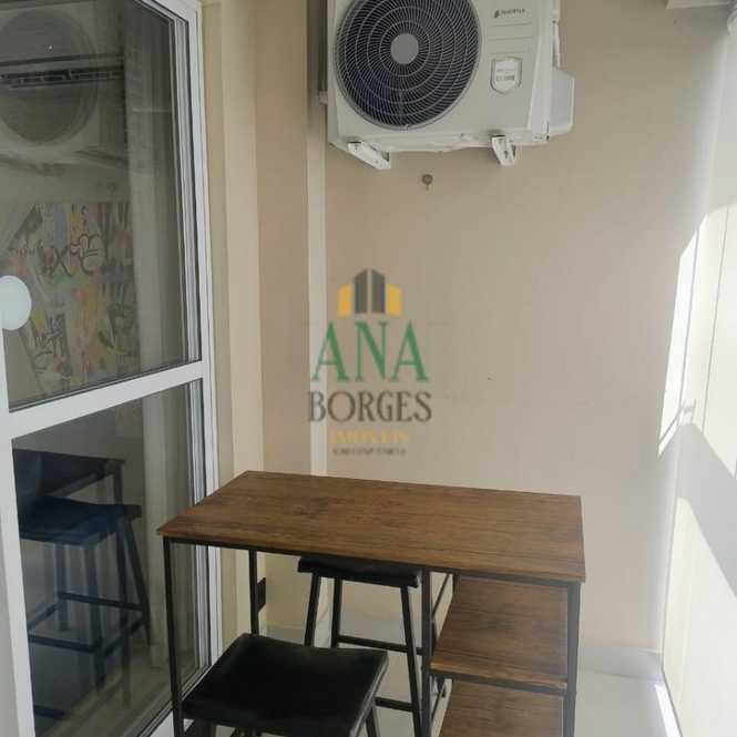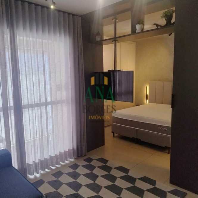 Apartamento studio mobiliado com sala de estar, sacada, cozinha, lavanderia, banheiro social, dormitório e garagem coberta.
