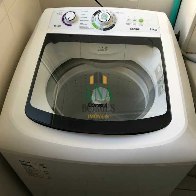 Geladeira, fogão, micro ondas e máquina de lavar na lavanderia e sacada com poltrona.